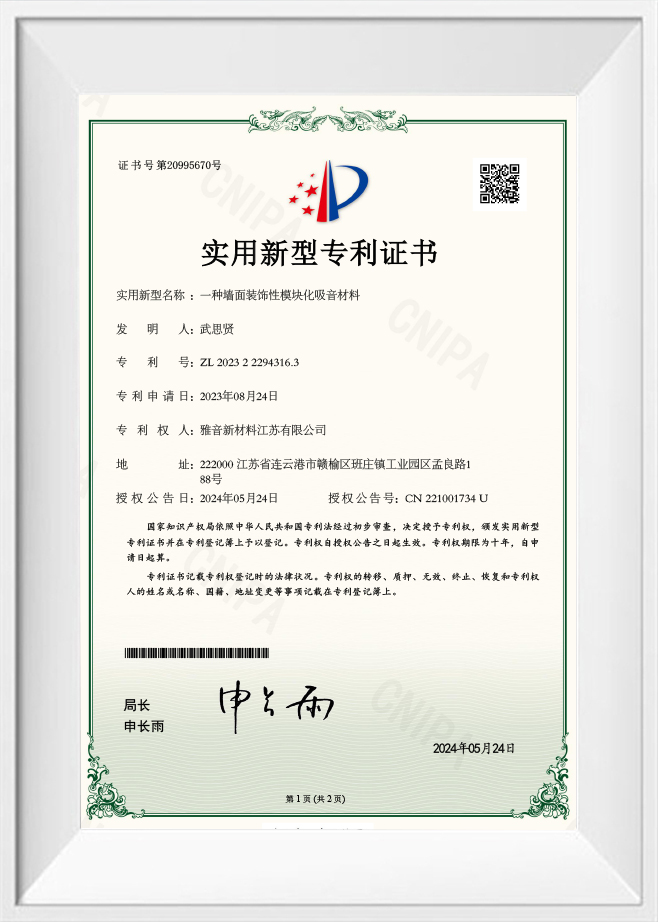 Giấy chứng nhận bằng sáng chế cho vật liệu hấp thụ âm thanh mô-đun để trang trí tường